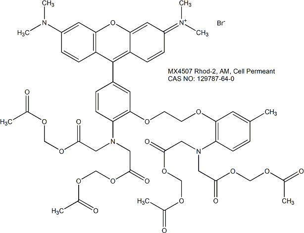 基本特性: 1) CAS NO:129787-64-0 2) 化学名:9-[4-[bis[2-[(acetyloxy)methoxy]-2-oxoethyl]amino]-3-[2-[2-[bis[2-[(acetyloxy)methoxy]-2- oxoethyl]amino]phenoxy]ethoxy]phenyl]-3,6-bis(dimethylamino)-xanthylium, monobromide 3) 同义名:Rhod-2, Acetoxymethyl Ester 4) 分子式:C52H59N4O19Br 5) 分子量:1123.96 6) 外观:红色固体 7) 最大激发/发射波长:549/578 nm 8) Kd(Ca2+结合):570NM 9) 溶解性:溶于DMSO(2~5mM)