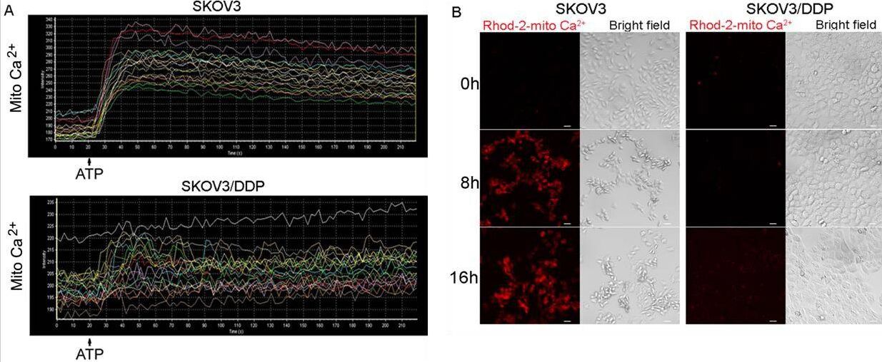 Fig 1. 顺铂或ATP处理诱导SKOV3细胞线粒体Ca2+内流,并非SKOV3/DDP细胞。A)两种细胞系分别用ATP诱导处理,时间序列扫描检测线粒体Ca2+变化,通过共聚焦显微镜得到数据。B)细胞用6 μg/ml顺铂处理0h,8h和16h后用共聚焦显微镜检测(bar,20 μm)。