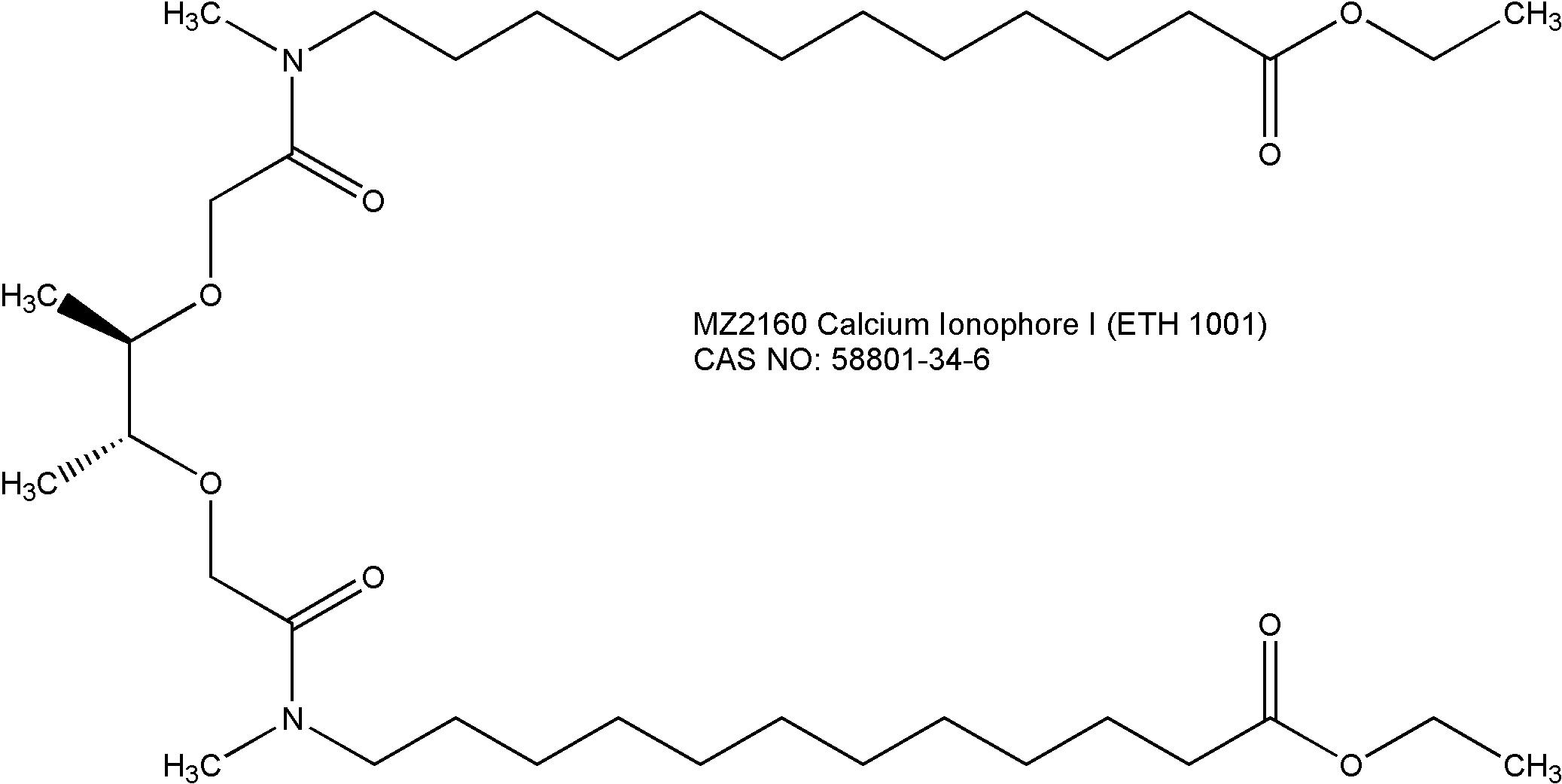 产品描述 钙离子载体I(Calcium Ionophore I),又称作ETH 1001、CA 1001,是一种中性离子载体,对钙离子(Ca2+)具极高选择性。ETH 1001能提高Ca2+的跨膜运输,被证实用于钙转运研究。ETH 1001以载体的身份用于设计Ca2+-选择性的膜微电极,从而用于Ca2+测定。 补充小知识: 1)作用机理是什么?离子载体(Ionophores)通过结合和转运特定离子穿越生物膜而发挥作用。这种类型的化合物同时具亲水和疏水结构,实质上是溶解和再现在不可渗透膜的另一边。CA1001经设计特异性转运钙离子。具高选择性,使其能检测膜电极上的钙活性,使其称为更好的选择用于医疗器械和钙运输研究。 2)CA1001的应用有哪些?钙离子载体可用在微电、医疗器械和科学研究中。这些包括男性不孕治疗和糖尿病诊疗方法的研发。在实验室中用作人工钙离子载体,将钙离子转运穿透膜。在电导计中用作充填液,特别是用于检测钙水平的离子选择性电极(ISE)。 产品特性 1) CAS NO:58801-34-6 2) 化学名:1,34-diethyl ester, 13,17R,18R,22-tetramethyl-14,21-dioxo-16,19-dioxa-13,22- diazatetratriacontanedioic acid 3) 同义名:ETH 1001;CA 1001; 4) 分子式:C38H72N2O8 5) 分子量:685.0 6) 纯度:>97%(TLC&NMR) 7) 外观:液体 8) 溶解性:溶于DMSO,无水乙醇
