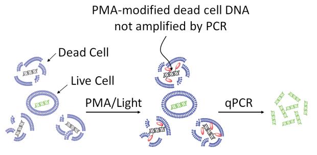 产品描述 叠氮溴化丙锭(Propidium Monoazide,PMA)是一种光反应的DNA结合染料,用于微生物(比如:细菌、病毒和真菌)的活力PCR(v-PCR)分析。作为一种DNA修饰剂和光反应染料,PMA高亲和结合DNA。经可见光刺激发生光裂解后,PMA共价吸附到DNA上,这一改性的DNA不能被PCR扩增。PMA染料不具细胞膜渗透性,因此,在含活死细胞的群体内,只有死细胞对DNA修饰剂敏感,由于具受损的细胞膜。PMA染料的这一特性,使其高度适合通过qPCR的手段来选择性检测活细菌(见Fig 1. PMA的作用机理)。