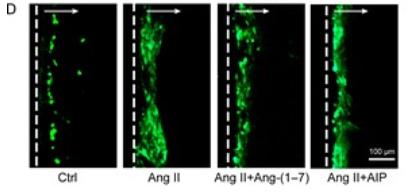 Fig. Ang-(1–7) and AIP reversed CaMKII activation and upregulation of α-SMA, TGF-β1 and Cx43 in Ang II-induced neonatal rat cardiac fibroblasts(A) Representative immunohistochemistry images of α-SMA (green) and Cx43 (red), and quantification of integrated density of α-SMA and Cx43 (right). Scale bars = 30 μm. (B,C) Western blot analysis of p-CaMKII, ox-CaMKII, CaMKII, α-SMA, TGF-β1 and Cx43, and quantification of the protein bands (right). (D) Fluorescence images showing Lucifer yellow dye transfer after scrape loading. n = 3. *P < 0.05 versus the control group; #P < 0.05 versus the Ang II group.