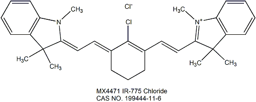 产品特性 1) CAS NO:199444-11-6 2) 化学名:2-[2-[2-Chloro-3-[2-(1,3-dihydro-1,3,3-trimethyl-2H-indol-2-ylidene)ethylidene]-1-cyclohexen-1-yl] ethenyl]-1,3,3-trimethyl-3H-indolium Chloride 2-[2-[2-氯-3-[2-(1,3-二氢-1,3,3-三甲基-2H-吲哚-2-亚基)-亚乙基]-1-环己烯-1-基]-乙烯基]-1,3,3-三甲基-3H-吲哚鎓氯化物 3) 分子式:C32H36Cl2N2 4) 分子量:519.55 g/mol 5) 纯度:≥98.0% 7) 外观:结晶或粉末 8) 溶解性:溶于水,1N NaOH,甲醇 9) λmax:772.0 to 777.0nm (MeOH) 10)摩尔消光系数:≥240000 (MeOH, 772.0 to 777.0 nm)