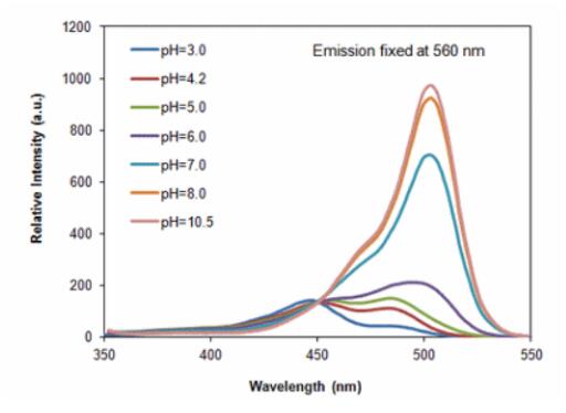 2) 外观:固体 3) 溶解性:溶于DMSO 4) Ex/Em:503/526nm 保存与运输方法 保存:-20℃避光干燥保存,至少1年有效。 运输:冰袋运输。 注意事项 1)荧光染料都存在淬灭问题,操作或保存过程中尽量避光,减缓荧光淬灭。 2)为了您的安全和健康,请穿实验服并戴一次性手套操作。 使用方法(仅作参考) 1)制备1-10mM的DMSO储存液,分装后置于-20℃保存,至少3个月稳定。 2)稀释到不同pH缓冲液内,使其工作浓度是10~50 µM。 3)测定激发光谱(使用固定的发射波长560nm)(见下参考图)。