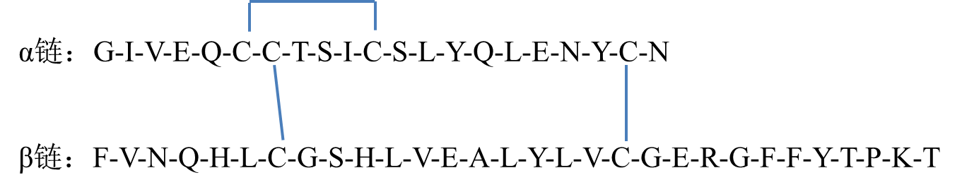 猪胰岛素和人胰岛素只有一个氨基酸的差异,即:β链中C末端用丙氨酸(A)替代苏氨酸(T)。