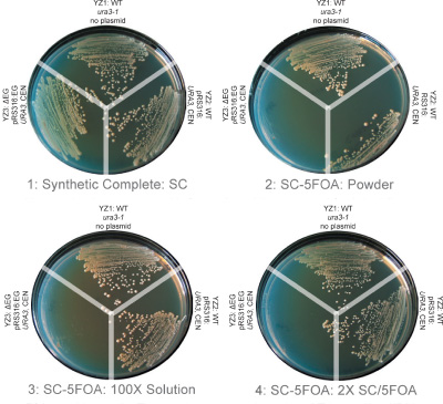 From left to right, top to bottom are synthetic complete glucose medium (SC): 1. SC, synthetic complete no 5FOA; 2. Standard - SC-5-FOA (SC-5-FOA made from ultra-pure 5-FOA powder, 1 g/liter) 3. SC-5-FOA made from 100X 5-FOA solution; 4: SC-5-FOA made from 2X SC/5-FOA.